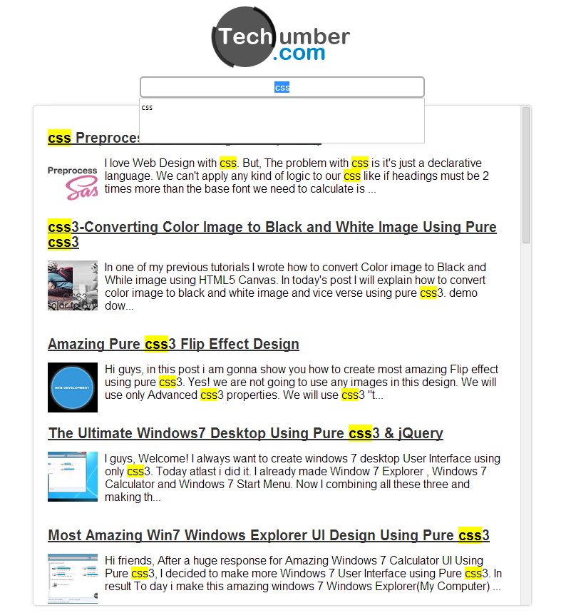 This is the heart of this app. Here we will loop through all entries(posts) and create the result in HTML format and append that to the index.html div with id “out”. In the result, we will show the title of the post with link, post thumbnail and post a summary. To get all this values we will use helper functions getLink, getTitle, getDesc, getThumb. The code itself explains everything. Now, since everything is done just open your index.html in localhost and enter some search term. I’m Entering CSS the result will be…